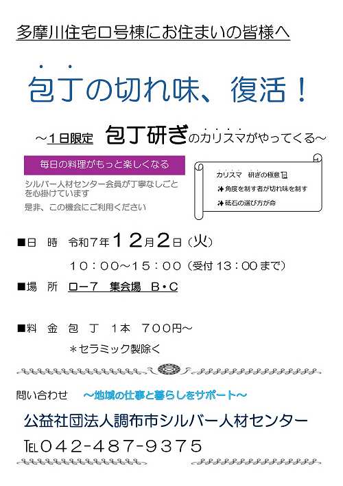 今年2回目となる多摩川住宅ロ号棟にて、出張包丁研ぎを実施します。